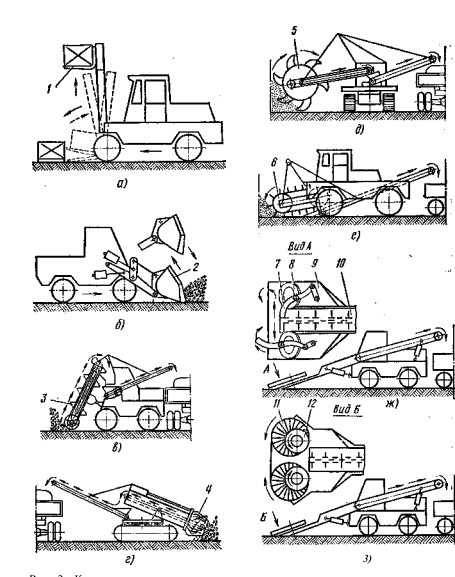 а – вилочного; б – одноковшового; в – многоковшового; г, д – роторных; е – скребкового; ж – с нагребающими лапами; з – с подгребающими дисками