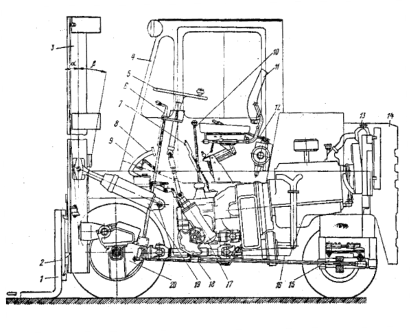 1 —грузовые вилы; 2 — подъемная каретка;3 — грузоподъемник; 4 — кабина; 5 — рулевое управление; 6 — рычаг управления механизмом обратного хода; 7 — рычаг стояночного тормоза; 8 —тормозная педаль; 9 — педаль управления подачей топлива; 10 — рычаг переключения передач; 11 — сиденье; 12 ~ рычаг гидрораспределителя; 13 — двигатель внутреннего сгорания; 14 — противовес; 15 — задняя подвеска; 16 — рама; 17 — гидроусилитель рулевого управления; 18 — продольная рулевая тяга; 19 — гидравлический цилиндр наклона; 20 — передний ведущий мост