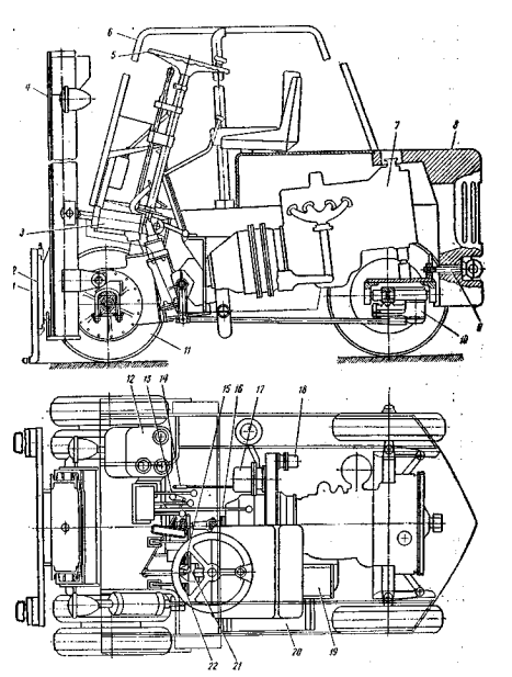 грузовые вилы ; 2 — подъемная каретка; 3 - цилиндры наклона грузоподъемника;4 - грузоподъемник; 5 — рулевое колесо; 6 — навес; 7 — двигатель; 8 — противовес; 9 - буксирное устройство; 10 — задняя подвеска; 11 — передний мост; 12 — масляный бак; 13,14, 16, 21 — рычаги управления гидрораспределителем, стояночным тормозом, коробкой передач и механизмом обратного хода; 15, 22 — педали сцепления и тормоза; 17, 18 - насосы; 19 — аккумуляторная батарея; 20 — топливный бак