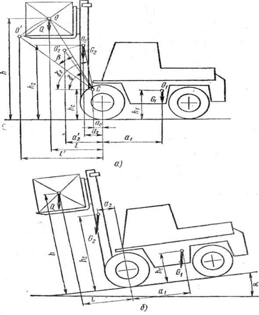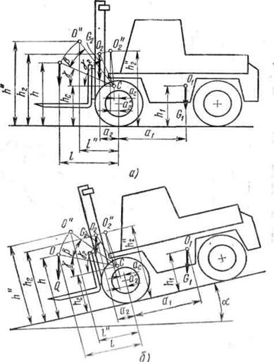 Рисунок 2.16 - Схемы продольной устойчивости вилочных погрузчиков с поднятым грузом: a - при штабелировании; 6 — на уклоне
