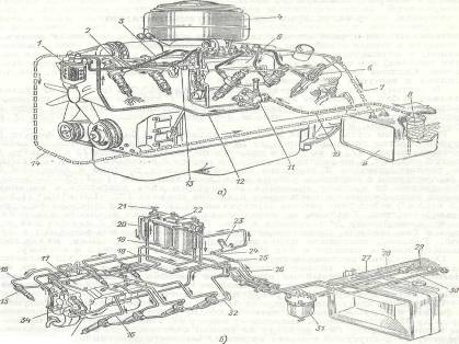 а — дизеля ЯМЗ-236; б — дизеля автомобиля КамАЗ-5320; 1 и 22 — фильтры тонкой очистки топлива; 2, 3, 7, 10, 12, 14, 16, 18, 19, 20, 24, 28, 29, 30, 32 и 33 — топливопроводы; 4 — воздухоочиститель; 5 к 17 — насосы высокого давления; 6 и 15 - форсунки; 8 и 31 — фильтры грубой очистки топлива; 9 и 27 — топливные баки; 11, 23 и 34 — топлнвоподкачивающяе насосы; 13 — перепускной клапан; 21 - кран отбора топлива к подогревателю; 25 и 26 - тройники