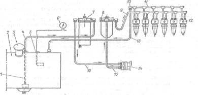 Рассмотрим путь топлива в системе питания. Из бака 9 через фильтр 8 грубой очистки по топливопроводу 10 топливо поступает к топливоподкачивающему насосу 11, от которого подается по топливопроводу 12 к фильтру 1 тонкой очистки, а по топливопроводу 2 к насосу 5 высокого давления. Насос по топливопроводам 3 высокого давления подает топливо в форсунки 6 в соответствии с порядком работы цилиндров двигателя (1—4—2—5—3—6). Независимо от частоты вращения коленчатого вала двигателя в каналах насоса поддерживается постоянное давление топлива 130—150 кН/м2 (1,3-— 1,5 кгс/см2 ) вследствие работы перепускного клапана 13 и жиклера фильтра тонкой очистки. Топливо, не использованное в насосе высокого давления, но топливопроводу 14 сливается в бак. Топливопроводы 7 служат для отвода в бак топлива, просочившегося между распылителем форсунки и иглой. Топливо, постоянно циркулирующее в системе питания, охлаждает головку насоса, отводит в бак топливо и воздух, попавший в систему.