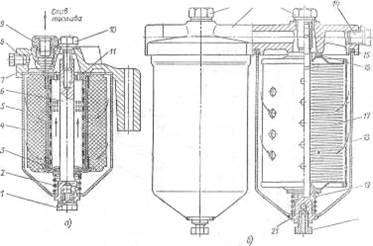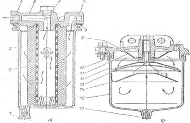 Фильтр тонкой очистки топлива дизеля ЯМЗ-236. Сменный фильтрующий элемент 4 фильтра (рис. 4, а) надет на стержень 6, приваренный к корпусу 5. Корпус фильтра закрыт крышкой 7, удерживаемой болтом 10, ввернутым в стержень. Фильтрующий элемент представляет собой перфорированный металлический каркас, обмотанный ситцевой лентой. На этом каркасе сформирована фильтрующая масса из древесной муки, пропитанной пульвербакелитом. Чтобы топливо не могло миновать фильтрующий элемент, он пружиной 2 прижат к крышке, имеющей отверстия для подвода топлива и его отвода. Топливо, подаваемое топливоподкачивающим насосом, заполняет