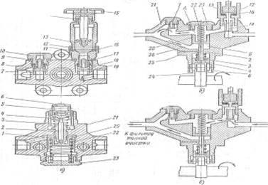 Когда эксцентрик сходит с ролика толкателя, пружина 3 возвращает толкатель в исходное положение. Одновременно пружина 22, разжимаясь, перемещает поршень 20 в обратную сторону. Над поршнем в полости А создается разрежение, а под поршнем в полости Б повышенное давление. Выпускной клапан 7 садится на седло, и топливо из полости Б по каналам насоса и трубопроводу поступает к фильтру тонкой очистки (рис. 5, в). Вследствие наличия разрежения над поршнем открывается впускной клапан 19, и топливо заполняет полость А. При следующем набегании эксцентрика на ролик толкателя рассмотренные процессы повторяются.