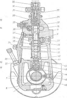 1 — автоматическая муфта опережения впрыска топлива; 2 — гайка; 3 — шпонка; 4 —втулка; 5 — бинт-ограничитель; в — рейка; 7 — перепускной клапан; 8 — корпус насоса; 9 — гильза плунжера; 10 — плунжер; 11 — ниппель; 12 и 29 — пробки; 13 — сапун; 14 — корпус регулятора; 15 — кулачковый вал; 16 — самоподжимной сальник; 17 — конический роликоподшипник; 18 — топливоподкачивающий насос; 19 — кулачок; 20 — регулировочные прокладки; 21 — крышка подшипника; 22 — указатель уровня масла; 23 — крышка; 24 — винт крепления крышки; 25 — верхняя тарелка пружины; 26 — зубчатый венец; 27, 37 и 45 — винты; 28 — канал отвода топлива; 30 — штуцер; 31 — упор клапана; 32 — колпачковая гайка; S3 — пружина нагнетательного клапана; 34 — нагнетательный клапан; 35 — седло нагнетательного клапана; 36 — канал подвода топлива; 38 — поворотная втулка; 39 — пружина; 40 — нижняя опорная тарелка пружины; 41 — регулировочный болт; 42 — контргайка; 43 - толкатель; 44 — ролик толкателя; 46 - промежуточная опора кулачкового вала