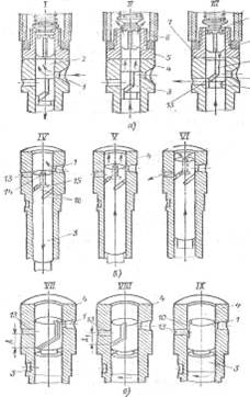 а — плунжер с продольной и отсечной кромками; б — плунжер с двумя спиральными канавками; в — работа плунжерной пары; І и IV — впуск топлива; II я V — начало подачи; ІІІ и VI — конец подачи; VII — максимальная подача; VIII — средняя подача; IX — отсутствие подачи; І — впускное отверстие; 2 — надплунжерное пространство; 3 — плунжер; 4 — гильза плунжера; 5 — нагнетательный клапан; 6 — штуцер; 7 — седло нагнетательного клапана; 8 — разгрузочный поясок клапана; 9 — прокладка; 10 — продольный паз плунжера; 11 — отсечная кромка плунжера; 12 — кольцевая проточка; 13 — перепускное отверстие; 14 — осевое отверстие в плунжере; 15 — диаметральное отверстие в плунжере; 16 — спиральные канавки на плунжере