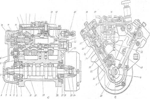 а — продольный разрез; б — поперечный разрез; 1 — корпус; 2 — ведущая шестерня; 3 — сухарь; 4 — фланец ведущей шестерни; 5 и 25 — шпонки; 6 — эксцентрик привода топливоподкачивающего насоса; 7 и 24 — гайки; 3 — промежуточная шестерня; 9 — палец; 10 — крышка регулятора; 11 — шестерня регулятора' 12 — державка грузов; 13 — ось грузов; 14 — груз; 15 — упорный шарикоподшипник; 16— муфта; 17 — палец; 18 — верхняя крышка; 19 — рычаг пружины; 20 -L перепускной клапан; 21 — втулка рейки; 22 — рейка; 23 — муфта регулировки опережения впрыска топлива; 25 — самоподжимной сальник; 27 — крышка подшипника; 28 — роликоподшипник; 29 — кулачковый вал; 30 — ролик толкателя; 31.— упорная втулка; 32 — пита толкателя; 31 — пружина; 34 — плунжер; 35 — впускное отверстие; 36 — корпус секции; 37 — нагнетательные клапан; 33 — штуцер; 39 — гильза (втулка) плунжера; 40 — рычаг реек