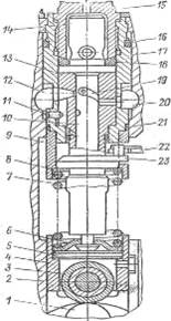 1 - кулачок распределительного вала; 2 — корпус насоса; 3 — ролик толкателя; 4 — толкатель; 5 — пята толкателя; 6 — тарелка пружины; 7 — пружина; 8 — опорная шайба; 9 — опорная втулка; 10 — плунжер; 11 — штифт; 12 — впускное отверстие; 13 — гильза плунжера; 14 — нагнетательный клапан; 15 — штуцер; 16 и 21 — уплотнительные кольца насосной секции; 17 — корпус насосной секции; 18 — шайба; 19 — спиральная канавка плунжера; 20 — перепускное отверстие; 22 — рейка; 23 — поворотная втулка плунжера