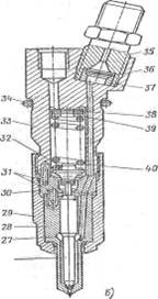 а — дизеля ЯМЗ-236; б — дизеля автомобиля КамАЗ-5320; 1 и 26 - иглы распылителей; 2 — медная шайба; 3 и 27 — кольцевые полости; 4 и 28 — распылители; 5 и 29 — накидные гайки; 31 и 6 — штифты; 7 — шарик; 8 и 33 — корпуса; 9 и 32 — штанги; 10 — тарелка пружины; 11 и 40 — пружины; 12 — регулировочный винт; 13 — стакан пружины; 14 — контргайка; 15 — колпак; 16 — прокладка; 17 и 37 — втулки; 18 и 36 — сетчатые фильтры; 19 — уплотнитель штуцера; 20 и 35 — штуцера; 21 и 23 — каналы; 22 — кольцевая проточка на распылителе; 24 — латунный стакан; 25 — головка блока; 30 — проставка; 34 - уплотнительное кольцо; 38 — регулировочные шайбы; 39 - опорная шайба