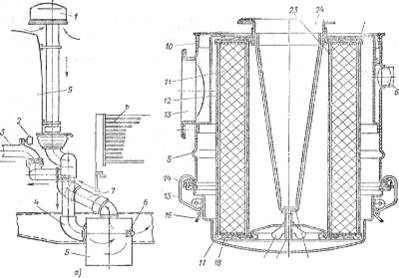 Система подачи и очистки воздуха дизеля автомобиля КамАЗ-5320. На этом дизеле применен воздухоочиститель (рис. 11, а и б) без масла, двухступенчатый, с инерционной решеткой, автоматическим отсосом пыли и сменным фильтрующим элементом. Колпак 1 для забора воздуха установлен сзади кабины 9, а воздухоочиститель 5 укреплен к левому лонжерону рамы. Воздухоочиститель состоит из корпуса 10, фильтрующего элемента 11, крышки 17, соединенной с корпусом защелками 15. Фильтрующий элемент имеет два защитных кожуха (наружный 12 и внутренний 23), между которыми размещен гофрированный картон. Сверху и снизу фильтрующий элемент плотно закрыт двумя основаниями 18 и 22, выполненными из листовой стали и залитыми клеем, плотно соединяющим кожухи и фильтрующий картон.