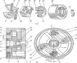 а — детали муфты; б — муфта в сборе; 1 — ведомая полумуфта; 2 — ось груза; 3 — уплотнительное кольцо; 4 — пружина; 5 — ведущая полумуфта; 6 — винт; 7 — втулка ведущей полумуфты; 8 и 12 — самоподжимные сальники; 9 — гайка крепления муфты; 10 — ступица ведомой полумуфты; 11 — шип; 13 — корпус; 14 — палац ведущей полумуфты; 15 — груз; 16 — пружинная шайба; 17 — шпонка; 18 - кулачковый вал топливного насоса; 19 - проставка; 20 - криволинейная поверхность груза