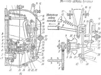 а — устройство; б — схема работы; І — скоба кулисы в положении «Работа»; ІІ — скоба кулисы в положении «Стоп»; 1 и 3 — шестерни; 2 — кулачковый вал топливного насоса; 4 — вал регулятора; 5 — стакан; 6 — ось грузов; 7 — державка; 8 — вал рычагов; 9 — рычаг пружины; 10 — рейка топливного насоса; 11 — тяга; 12 — стартовая пружина рычага репки; 13 — болт ограничителя максимальной частоты вращения; 14 — рычаг управления регулятором; 15 — болт ограничителя минимальной частоты вращения холостого хода; 16 — крышка смотрового люка; 17 — ось двуплечего рычага; 18 — двуплечий рычаг; 19 — пружина регулятора; 20, 22 и 29 — регулировочные винты; 21 — регулировочный болт; 23 — упорная пружина; 24 — серьга; 25 — корректор; 26 — силовой рычаг; 27 — рычаг рейки; 28 — скоба; 30 — палец; 31 — кулиса; 32 — пята; 33 — пробка отверстия для слива масла из регулятора; 34 - подвижная муфта; 35 - грузы; 36 - резиновые сухари