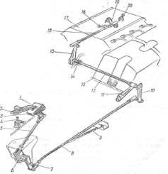 1 — ось педали; 2 — педаль подачи топлива; 3 — уплотнитель педали; 4 — упорный болт; 5 — передняя тяга; б — двуплечий рычаг; 7 — ось рычага; 8 — продольная тяга; 9 — возвратная пружина; 10 — рычаг вала привода; 11 — кронштейн вала; 12 — вал привода; 13 — двигатель; 14 — антифрикционная втулка; 15 — рычаг тяги; 16 — тяга рычага управления; 17 — насос высокого давления; 18 — болт ограничения минимальной частоты вращения; 19 — рычаг управления регулятором; 20 — болт ограничения максимальной частоты вращения