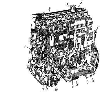 На рис. 2 представлена смазочная система двигателя легкового автомобиля ВАЗ. Смазочная система комбинированная, без масляного радиатора и с закрытой вентиляцией картера двигателя. Смазочная система включает в себя масляный поддон, масляный насос с редукционным клапаном и маслоприемником, масляный фильтр, маслопроводы (каналы в головке и блоке цилиндров, коленчатом и распределительном валах), заливную горловину и указатель уровня масла. Масло заливают в поддон 12 через горловину 3 и его количество контролируют специальным стержнем 8, конец которого находится в масляной ванне.