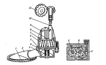 1 — сетка; 2 — патрубок; 3 — клапан; 4 — пружина; 5 — крышка; 6, 8, 11 — шестерни; 7 — корпус; 9 — ось; 10 — вал