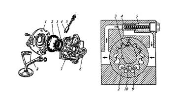 Рис. 4. Масляный насос с шестернями внутреннего зацепления: 1 — корпус; 2, 3 — шестерни; 4 — клапан; 5 — пружина; 6 — манжета; 7 — крышка; 8 — маслоприемник; 9 — выступ; 10 — вал