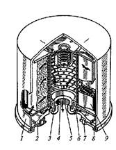 Рис. 5. Масляный фильтр; 1 — корпус; 2 — днище; 3, 5 — клапаны; 4, 6 — отверстия; 7 — кольцо; 8— крышка; 9 — фильтрующий элемент