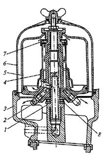 Рис. 6. Фильтр центробежной очистки масла: 1 – ось; 2 – жиклер; 3 – корпус; 4 – ротор; 5 – колпак; 6 – крышка; 7 – сетка; 8 – подшипник