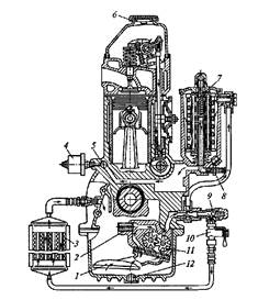 Рис. 7. Смазочная система с масляным радиатором: 1 – маслоприемник; 2, 9 — клапаны; 3 — радиатор; 4, 8 — датчики; 5 — магистраль; 6 — горловина; 7 — фильтр; 10 — кран; 11 — насос; 12 — поддон
