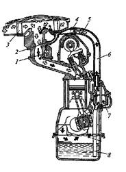 Рис. 8. Вентиляция картера двигателя: 1 — золотник; 2, 6 — шланги; 3 — воздушный фильтр; 4 — коллектор; 5 — пламегаситель; 7 — маслоотделитель; 8 – трубка