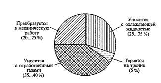 При чрезмерном охлаждении двигатель также теряет мощность, ухудшается его экономичность и возрастает изнашивание. Для принудительного и регулируемого отвода теплоты в двигателях автомобилей применяют два типа системы охлаждения (рис. 9). Тип системы охлаждения определяется теплоносителем (рабочим веществом), используемым для охлаждения двигателя. Применение в двигателях различных систем охлаждения зависит от типа и назначения двигателя, его мощности и класса автомобиля. В жидкостной системе охлаждения используются специальные охлаждающие жидкости — антифризы различных марок, имеющие температуру загустевания - 40 °С и ниже. Антифризы содержат антикоррозионные и антивспенивающие присадки, исключающие образование накипи. Они очень ядовиты и требуют осторожного обращения. По сравнению с водой антифризы имеют меньшую1 теплоемкость и поэтому отводят теплоту от стенок цилиндров двигателя менее интенсивно. Так, при охлаждении антифризом температура стенок цилиндров на 15...20°С выше, чем при охлаждении водой. Это ускоряет прогрев двигателя и уменьшает изнашивание цилиндров, но в летнее время может привести к перегреву двигателя. Оптимальным температурным режимом двигателя при жидкостной системе охлаждения считается такой, при котором температура охлаждающей жидкости в двигателе составляет 80 ...100 °С на всех режимах работы двигателя. Это возможно при условии, что с охлаждающей жидкостью уносится в окружающую среду 25...35 % теплоты, выделяющейся при сгорании топлива в цилиндрах двигателя. При этом в бензиновых двигателях величина отводимой теплоты больше, чем в дизелях. На рис. 10 приведена диаграмма распределения теплоты, выделяющейся при сгорании топлива в цилиндрах двигателей автомобилей при жидкостной системе охлаждения. Из диаграммы следует, что в механическую работу преобразуется 20...35% теплоты, уносится с отработавшими газами 35...40%, теряется на трение 5 % и уносится с охлаждающей жидкостью 25...35 % теплоты.