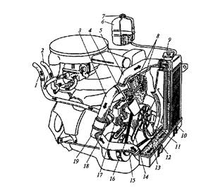 Рис. 11. Система охлаждения двигателя: 1, 2, 3, 5, 15, 18 — шланги; 4 — патрубок; 6 — бачок; 7, 9 — пробки; 8 — рубашка охлаждения; 10 — радиатор; 11 — кожух; 12 — вентилятор; 13, 14 — шкивы; 16— ремень; 17— насос; 19 — термостат