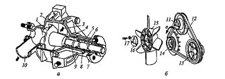 Рис. 12. Жидкостный насос (а) и вентилятор (б) двигателя: 1 — крыльчатка; 2 — корпус; 3 — окно; 4 — крышка; 5 — подшипник; 6 — вал; 7 — ступица; 8 — винт; 9 — уплотнительное устройство; 10 — патрубок; 11, 13,14 — шкивы; 12 — ремень; 13 — вентилятор; 16 — накладка; 17 — болт