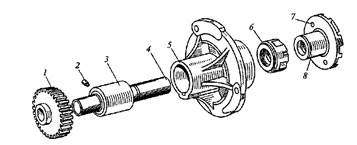 Рис. 13. Жидкостный насос двигателя: 1 — шкив; 2 — винт; 3 — подшипник; 4 — вал; 5 — корпус; 6 — уплотнительное устройство; 7 — отверстие; 8 — крыльчатка