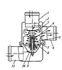 Термостат (рис. 14) имеет два входных патрубка 1 и 11, выходной патрубок 6, два клапана (основной 8, дополнительный 2) и чувствительный элемент. Термостат установлен перед входом в насос охлаждающей жидкости и соединяется с ним через патрубок 6. Через патрубок 1 термостат соединяется с головкой блока цилиндров двигателя, а через патрубок 11 — с нижним бачком радиатора.