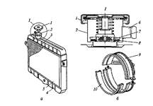 Рис. 15. Неразборный радиатор (а) и кожух (б) вентилятора двигателя: 1 — пробка; 2 — горловина; 3,4— бачки; 5 — сердцевина; 6 — патрубок; 7, 8 — клапаны; 9 — кожух; 10 — уплотнитель