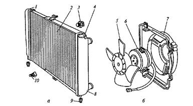 Рис. 16. Разборный радиатор (а) и электровентилятор (6) двигателя: 1, 8— бачки; 2 — сердцевина; 3 — датчик; 4 — прокладка; 5 — вентилятор; 6 — электродвигатель; 7 — кожух; 9 — опора; 10 — пробка
