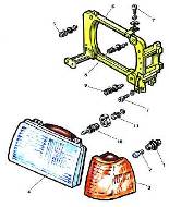 Рис. 2.2. Фара у розібраному стані 1 - патрон лампи покажчика повороту; 2 - лампа покажчика повороту; 3 - покажчик повороту; 4 - фара; 5 - гвинт регулювання фари в вертикальній площині; 6 - стійка фари; 7 - гвинт; 8 - гвинт кріплення фари; 9 - гвинт регулювання фари в горизонтальній площині; 10 - патрон з лампою фари; 11 - сполучна колодка