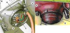 4) фара (вигляд на фару із відсіку двигуна: а) захисний ковпак знятий; б) захисний ковпак установлений (Додаток А, Рис. 2.3.));