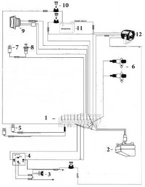 Рис. 3.1. Схематична будова сигналізації 1 – блок сигналізації; 2 – датчик з дистанційним регулюванням; 3 – замок запалювання; 4 – реле блокування стартера; 5 , 7 – лампи зовнішніх світлових приладів; 6 – кінцевики багажника, капота; 8 – кінцевик дверей; 9 – кодований перемикач; 10 – запобіжники; 11 – акумуляторна батарея; 12 – автономна сирена.