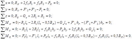 Считая, что автогрейдер находится в равновесии под действием системы сил и реакций, показанной на рисунке 2.4.3.1, а, можно найти силы и реакции из шести уравнений равновесия относительно пространственной системы координат xyz . Начало координат в точкеО