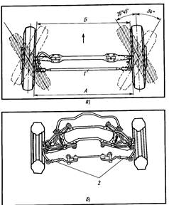 Нужное соотношение углов поворота управляемых колёс обеспечивается регулировкой схождения (разница расстояний А – Б), которая осуществляется поперечной тягой (рис. 1,а) или боковой тягами (рис.1,б).
