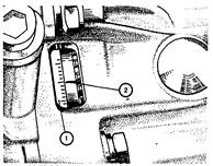 Рис.5. Метки для установки момента зажигания: 1 - шкала; 2 - метка на маховике