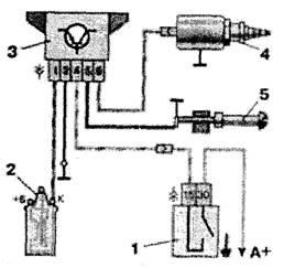 Цепь питания первичной обмотки катушки зажигания прерывается электронным коммутатором. Управляющие импульсы на коммутатор подаются от бесконтактного датчика, расположенного в датчике-распределителе 4 зажигания.