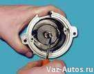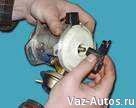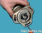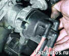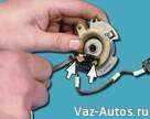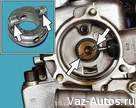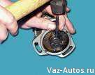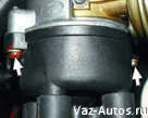 Грубо оценить исправность вакуумного регулятора можно непосредственно в автомобиле, На заведенном двигателе отсоединяем от штуцера вакуумный шланг, ведущий к регулятору. Если теперь создать в шланге давление (можно ртом), обороты мотора должны возрасти, а при снятии разрежен снизиться. Разрежение должно сохраняться, по крайней мере, несколько секунд если пережать шланг. Визуально в работоспособности можно убедиться, частично разобрав, датчик-распределитель и разрежение к впускному штуцеру регулятора. При этом пластина с датчиком должна поворачиваться на угол 7±1°, а при снятии разрежения - без возвращаться обратно.