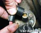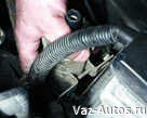 | 2. Отсоедините высоковольтные провода от распределителя зажигания. | 3. Отсоедините вакуумный шланг от вакуум-корректора распределителя. | 4. Выньте трос привода дроссельных заслонок из держателя. |