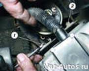 | 4. Отверните гайку 1 (обратите внимание, под гайкой установлены пружинная и плоская шайбы) и ослабьте затяжку гайки 2 крепления кронштейна катушки. | 5. Снимите катушку зажигания. | 6. Установите новую катушку зажигания в порядке, обратном снятию. При этом синий провод подсоедините к клемме "Б", а красный - к клемме "К". |