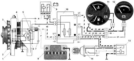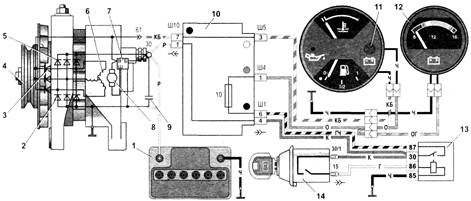 Рис. 1.3. Схема з'єднань системи генератора Г-222: 1 - генератор; 2 - негативний діод; 3 - позитивний діод; 4 - обмотка статора; 5 - регулятор напруги; 6 - обмотка ротора; 7 - конденсатор для придушення радіоперешкод; 8 - акумуляторна батарея; 9 - реле контрольної лампи заряду aккумуляторної батареї; 10 - монтажний блок; 11 - контрольна лампа заряду акумуляторної батареї в комбінації приладів; 12 - вольтметр; 13 - реле запалювання; 14 - вимикач запалювання