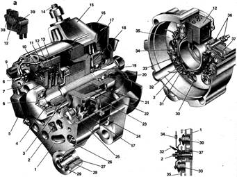 Рис. 1.2. Генератор 37.3701: а - регулятор напруги і щітковий вузол у генераторів випуску з 1996 р.; 1 - кришка генератора з боку контактних кілець; 2 - болт кріплення випрямного блоку; 3 - контактні кільця; 4 - кульковий підшипник вала ротора з боку контактних кілець; 5 - конденсатор 2,2 мкф ±20% для придушення радіоперешкод; 6 - вал ротора; 7 - провід загального виходу позитивних діодів; 8 - затискач "30" генератора для підключення споживачів; 9 - штекер "61 "генератора (загальний вихід додаткових діодів); 10 - провід виходу "Б" регулятора напруги; 11 - щітка, з'єднана з виходом "В" регулятора напруги; 12-регулятор напруги; 13 - щітка, з'єднана з виходом "Ш" регулятора напруги; 14 - шпилька для кріплення генератора до натяжного пристрою; 15 - кришка генератора з боку приводу; 16 - крильчатка вентилятора зі шківом приводу генератора; 17 - полюсний наконечник ротора; 18 - шайби кріплення підшипника; 19 - дистанційне кільце; 20 - кульковий підшипник вала ротора з боку приводу; 21 - сталева втулка; 22 - обмотка ротора (обмотка збудження); 23 - осердя статора; 24 - обмотка статора; 25 - випрямний блок; 26 - стяжний болт генератора; 27 - буферна втулка; 28 - втулка; 29 - підтискна втулка; 30 - негативний діод; 31 - ізолююча пластина; 32 - фазний вихід обмотки статора; 33 - позитивний діод; 34 - додатковий діод; 35 - тримач позитивних діодів; 36 - ізолюючі втулки; 37 - тримач негативних діодів; 38 – вихід "В" регулятора напруги; 39 – щіткотримач.