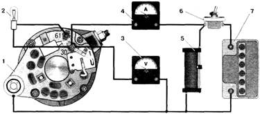 Рис. 4.1. Схема з'єднань для перевірки генератора 37.3701 на стенді: 1 - генератор; 2 - контрольна лампа 12 В, 3 Вт; 3 - вольтметр; 4 - амперметр; 5 - реостат; 6 - вимикач; 7 - акумуляторна батарея.