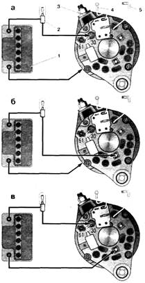 Рис 6.1. Схеми для перевірки діодів випрямного блоку: а - перевірка одночасно "позитивних" і "негативних" діодів; б - перевірка "негативних" діодів; в - перевірка "позитивних" діодів; 1 - акумуляторна батарея; 2 - контрольна лампа; 3 - генератор; 4 - вихід "Б" регулятора напруги; 5 - провід загального висновку додаткових діодів.