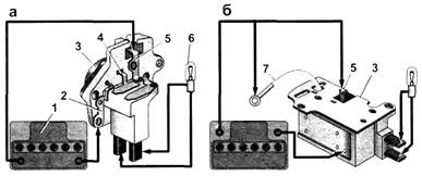 Рис. 7.1. Перевірка регулятора напруги у генератора 37.3701: а - випуску з 1996 р.; б - випуску до 1996 р.; 1 - акумуляторна батарея; 2 - вихід "маса" регулятора напруги; 3 - регулятор напруги; 4 - вихід "Ш" регулятора; 5 - вихід "В" регулятора; 6 - контрольна лампа; 7 - вихід "Б" регулятора напруги