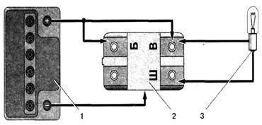 Рис. 7.2. Перевірка регулятора напруги у генератора Г-222: 1 -акумуляторна батарея; 2 - регулятор напруги; 3 - контрольна лампа.