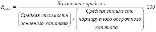 Для характеристики эффективности использования основного и оборотного капитала определяется рентабельность предприятия. Она представляет собой отношение суммы балансовой прибыли за отчетный период к сумме средней стоимости основного капитала и средней стоимости нормируемого оборотного капитала за отчетный период. Этот показатель часто называют рентабельностью капитала.