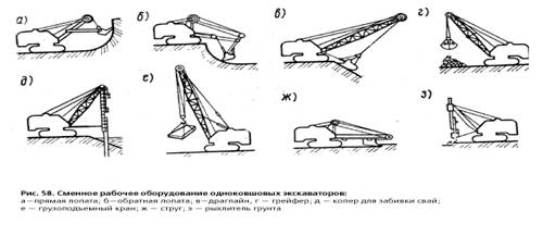 а - прямая лопата; б - обратная лопата; в - драглайн, г - грейфер; д - копер для забивки свай; е - грузоподъемный кран; ж - струг; э - рыхлитель грунта