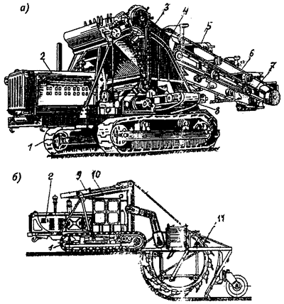 1 - ходовая часть; 2 - двигатель; 3 - цепная передача; 4 - бункер; 5 - ковши; 6 - ковшовая цепь; 7 - ковшовая рама; 8 - транспортер; 9, 10 - механизмы для подъема и привода рабочего органа; 11 - ковшовый ротор